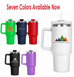 This 40 oz tumbler, with twist closure, straw lid, stainless steel outer, inner liner, marching color handles, with a black gift box |